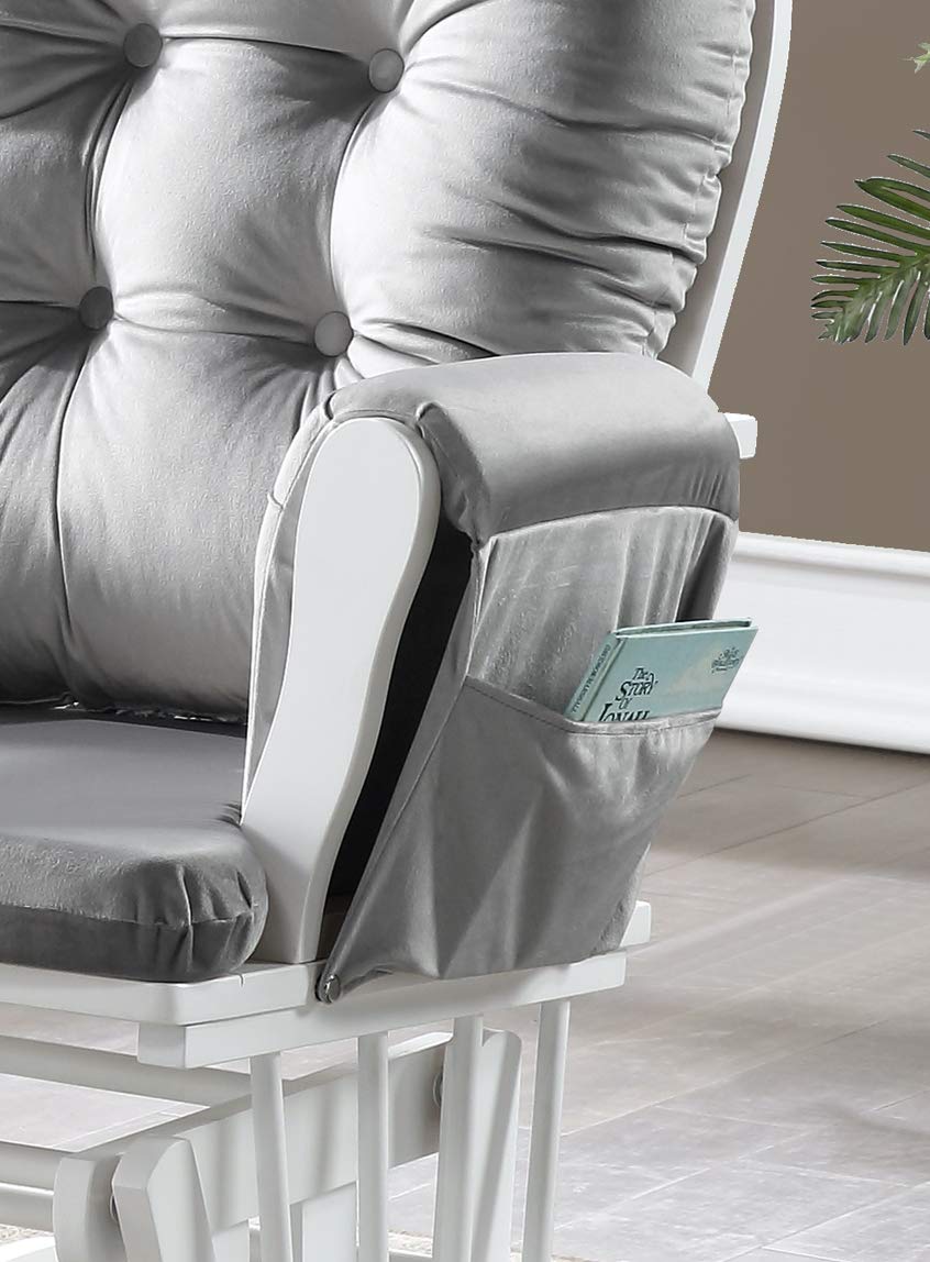 The Carson Glider and ottoman set features a classic style of tradition that easily fits into any decor. Offering soft quiet gliding motion, will soothe your baby and you as well. With amply stuffed back cushion and smart button tufting, this glider was built for comfort. Solid wood framing for long lasting durability and flair tapered arms for added support. Luxuriously soft fabric that is easy to care for, and can be wiped clean with a dry soft cloth, to keep it looking new. Adorned in the nursery, the den or the bedroom, it’s sure to be the favorite spot.